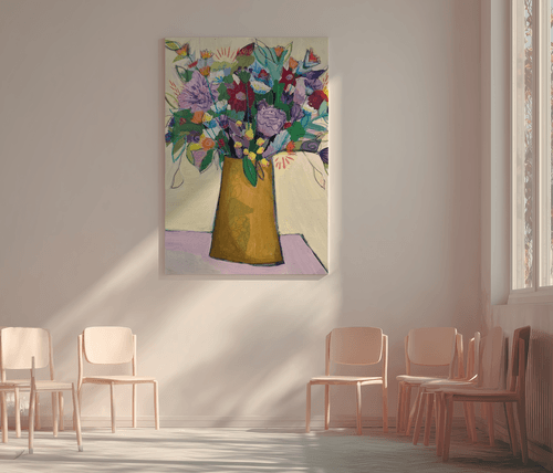 A celebration of color, form, and joyful abundance, "Blooms in Goldenrod Vase" brings a stylized bouquet to life with bold outlines and expressive brushwork. Radiant reds, violets, blues, and yellows bloom from a tall, golden-brown vase, their abstract shapes dancing against a soft neutral backdrop and lavender tabletop. The composition is both grounded and whimsical—an ode to everyday beauty reimagined through a contemporary lens.