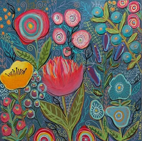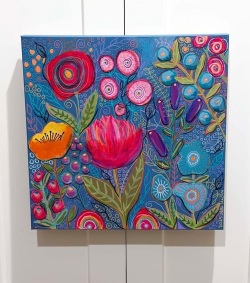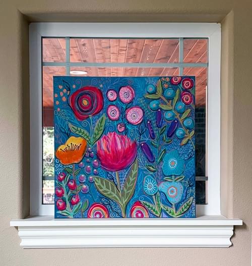 A joyful burst of color and imagination, this one-of-a-kind piece invites you into a whimsical garden where memory and magic intertwine. Stylized blooms, swirling leaves, and berry clusters dance across a deep blue backdrop, creating a layered tapestry of emotion and movement. Rich reds, playful pinks, and luminous greens evoke late-summer abundance, while intricate details whisper stories only the heart can hear. This painting is a celebration of nature’s exuberance and the quiet wonder of everyday beauty.