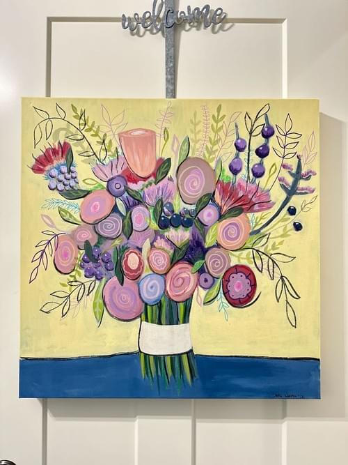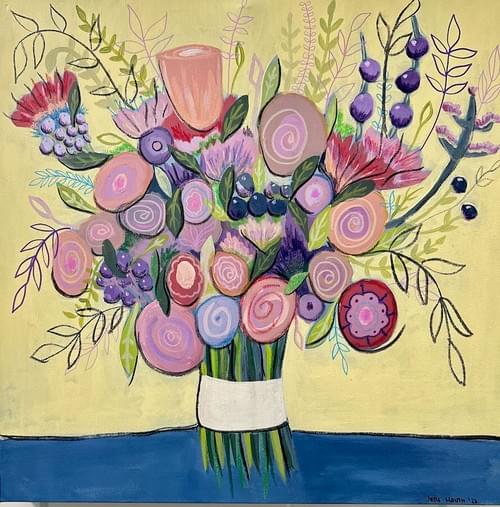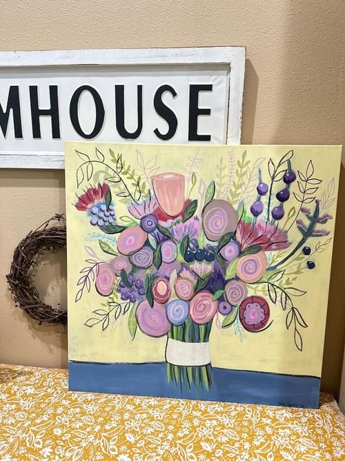 "Springtime Bouquet" invites viewers into a whimsical world of blooming color and rhythmic form. A bouquet of abstract florals and berries bursts from a vase adorned with a crisp white band, set against a soft yellow backdrop and grounded by a serene blue surface. Swirling patterns, circular centers, and layered petals in shades of magenta, violet, crimson, and sapphire create a sense of joyful movement and organic play.