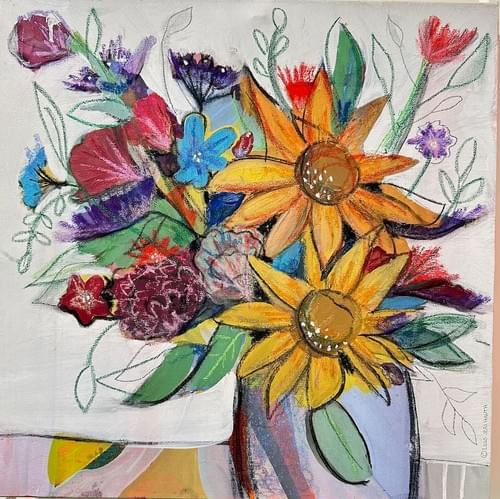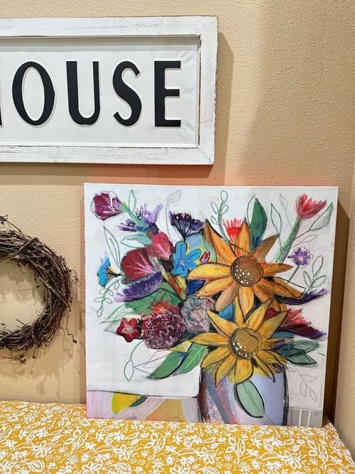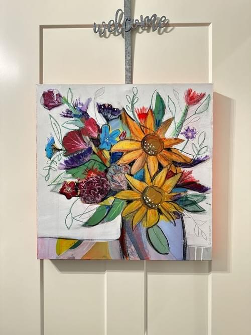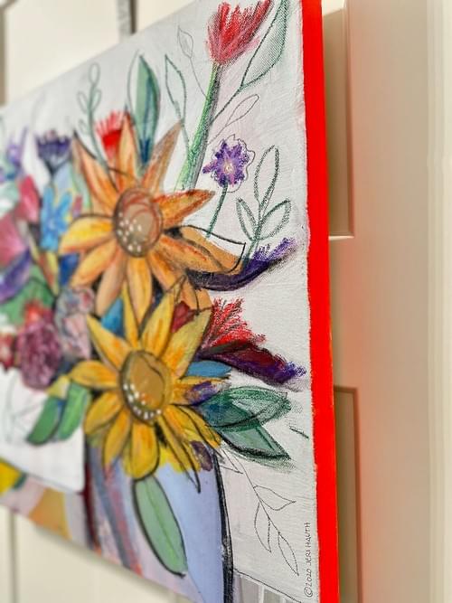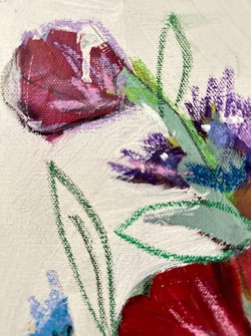 This piece is a celebration of nature’s exuberance, perfect for collectors who love bold florals, layered storytelling, and contemporary mixed media.
